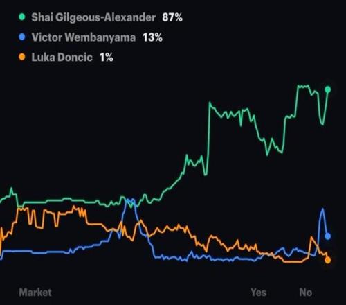 大數據也直觀展現這一點,在東契奇受傷后他拿下MVP的可能性暴跌至1%,對手SGA飆升至87%。