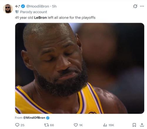 詹姆斯球迷:41歲的勒布朗要單核季后賽。(是詹姆斯搖頭閉眼的瞬間)