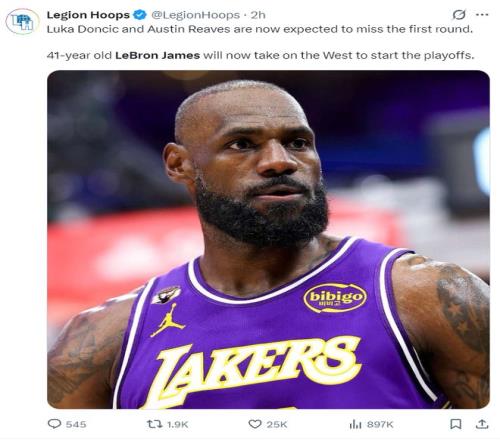 美媒LH寫道:東契奇與里夫斯預計將缺席季后賽首輪,41歲的勒布朗將單核帶隊征戰季后賽。
