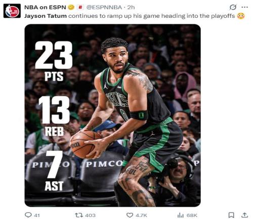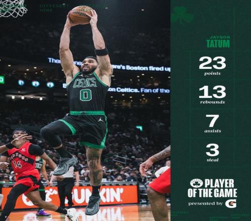 塔圖姆上一場拿到23+11+9,這一場拿到23+13+7,塔圖姆越來越全能,就連ESPN都說:塔圖姆在季后賽之前繼續(xù)提升自己的競技狀態(tài)。