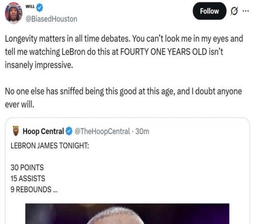 面對詹姆斯這樣的表現,作為季后賽潛在對手火箭隊的媒體人BiasedHouston也不禁稱贊到:“41歲詹姆斯依然無人能及,在討論歷史最佳時,持久性至關重要,41歲高齡的勒布朗還能做到這些真的令人震撼,在這個年齡,沒人能夠達到他的水平,我懷疑未來也沒人能做到。”