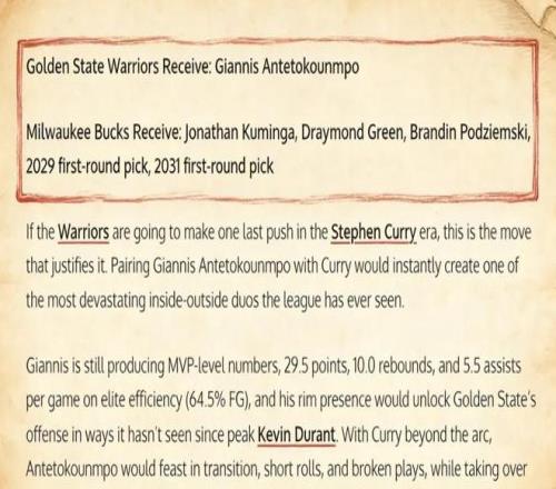 美媒《Fadeaway World》撰文建議,勇士可以打包將庫明加、格林、波杰姆斯基、2029年以及2031年的首輪簽送到雄鹿,換回這位兩屆常規賽MVP。