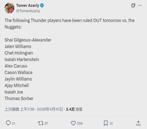 亞歷山大(斜肌傷勢)、杰倫-威廉姆斯(腿筋)、霍姆格倫(背傷)、哈滕(比目魚肌)、卡魯索(輪休)、卡森-華萊士(腳趾)、杰林-威廉姆斯(跟腱炎)、阿杰伊-米切爾(腳踝)、以賽亞-喬(膝部酸痛)、索伯(ACL)。
