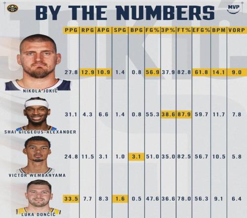 掘金官方今天曬出四個MVP候選人的數據對比,在這四個人當中,約基奇場均籃板、助攻、投籃命中率、有效命中率、基礎正負值和不可替代值六項數據領先。亞歷山大三分和罰球命中率領先,東契奇場均得分和搶斷領先,文班場均蓋帽領先。