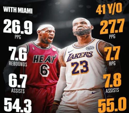 自從41歲生日夜以來,詹姆斯場均可以轟下 27.7分、7.7個籃板和7.8次助攻,投籃命中率高達55.0%,這一數據甚至超過了他熱火時期的巔峰表現;他連續9場比賽得分超過20分,創造了40歲后NBA歷史最長連續得分20+紀錄;41歲場均得分榜,詹姆斯同樣以22.6分排名歷史第一。