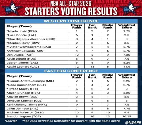 東西部五名首發球員由球迷(50%選票)、現役NBA球員(25%選票)和媒體(25%選票)共同選出: