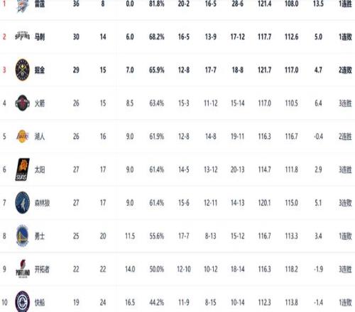 從目前西部的排名來看,雷霆仍然是以36勝8負(fù),排名西部第一,他們領(lǐng)先第二名的馬刺6個勝場。西部前三的爭奪相比起第三到第七位不是特別激烈,掘金和火箭分列二、三位。