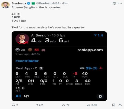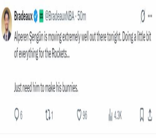 火記Bradeaux:申京今晚在場上移動得極為出色。為火箭隊貢獻了全方位的表現,他只需要做好自己就行。