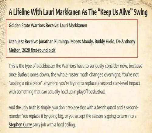 美媒《Fadeaway World》撰文建議,勇士可以將庫明加、穆迪、希爾德、梅爾頓以及2028年的首輪簽打包送往爵士,換回全明星前鋒馬爾卡寧。