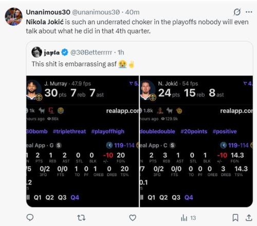 美媒:約基奇在季后賽中的數據表現太出色,以至于所有人忘記了他在第四節的貢獻多拉胯。
