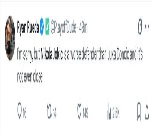 美記Ryan Ruede:很抱歉,約基奇的防守能力遠遜于東契奇,兩人防守能力不在一個層次。