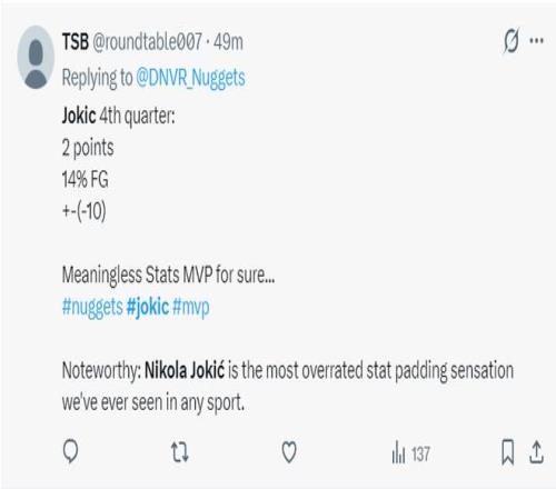 約基奇此役的末節8分鐘里,7中1,三分2中0,沒有罰球拿到2分3籃板1助攻1蓋帽,命中率14.3%,作為聯盟一哥來說這個決勝時刻表現太過于拉胯。他決勝時刻的表現也引來多方炮轟。