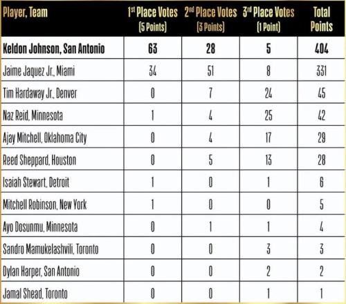 來自NBA官方的消息,馬刺隊鋒衛搖擺人凱爾登約翰遜榮獲2025-26賽季年度最佳第六人!隨后,NBA官方發布了三位最佳關鍵球員得分情況,具體如下:凱爾登約翰遜斬獲了63張第一選票,28張第二選票和5張第三選票,總得分高達404分;哈克斯拿到34張第一選票,51張第二選票和8張第二選票,總得分為331分;小哈達威拿到7張第一選票和24張第三選票,總得分僅為45分。值得一提的是,森林狼隊的里德(42分)、雷霆隊的米切爾(29分)、火箭隊的謝潑德(28分)、活塞隊的斯圖爾特(6分)、尼克斯隊的米羅(5分)、森林狼隊的道蘇姆(4分)、猛龍隊的馬穆(3分)、馬刺隊的哈珀(2分)和猛龍隊的謝德(1分)分享了剩余選票。