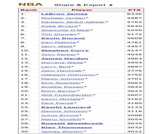 下圖是這份榜單目前的前30位,不是名人堂,就是未來的名人堂,而且不出意外的話,今年季后賽,他就能超越詹姆斯沃西、克萊湯普森、威少、吉諾比利等人。