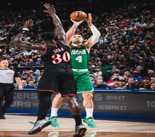 重新回到賽場之后,76人開始在防守端給杰倫布朗上強度,根本不給他輕松出手的機會,但效果并不明顯,四節戰罷杰倫布朗還是靠著16次出手命中9球的發揮,打出了25分、7個籃板、4次助攻、1次搶斷和3個封蓋的全能數據,不過失誤偏多達到了6個,此戰結束之后,杰倫布朗超越隊史傳奇帕里什,成為了綠軍隊史季后賽得分排名第七的球員。
