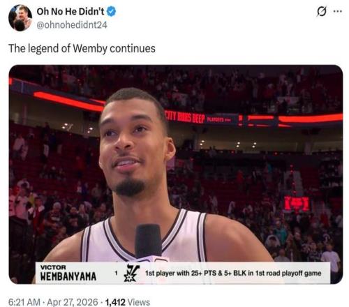 憑借這樣的表現(xiàn),文班亞馬成為NBA歷史上首位在生涯首場(chǎng)季后賽客場(chǎng)就能至少拿下25分5帽的球員,也成為2003年鄧肯之后,首位在季后賽單場(chǎng)至少拿下25分10板,且搶斷+蓋帽不少于10次的球員。