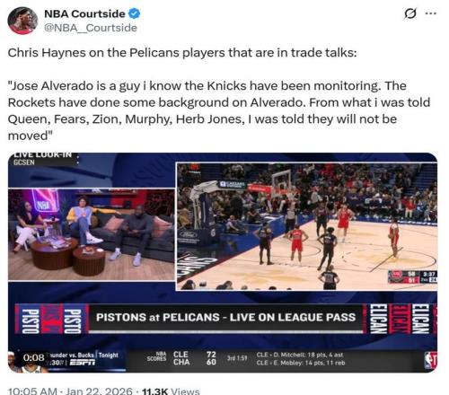 尼克斯隊(duì)記Ian Begley也曾曝出球隊(duì)一直都在等待鵜鶘隊(duì)將阿爾瓦拉多正式擺上貨架。