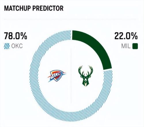 賽前,美媒ESPN對(duì)本場(chǎng)比賽進(jìn)行了勝率預(yù)測(cè),雷霆隊(duì)勝率依舊高達(dá)78.0%,占據(jù)絕對(duì)上風(fēng),雄鹿勝率則僅有22.0%,還是不被看好。