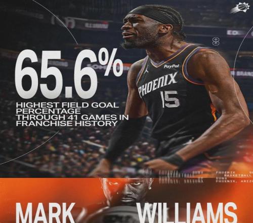 馬威在賽季前半程投籃命中率65.6%,打破太陽隊史紀錄。本賽季他場均出戰(zhàn)23.9分鐘,得到12.2分8.3籃板1助攻1.1搶斷1蓋帽1.2失誤,投籃命中率65.9%,罰球命中率78.4%。場均3.2個前場板聯(lián)盟第9;投籃命中率聯(lián)盟第3!