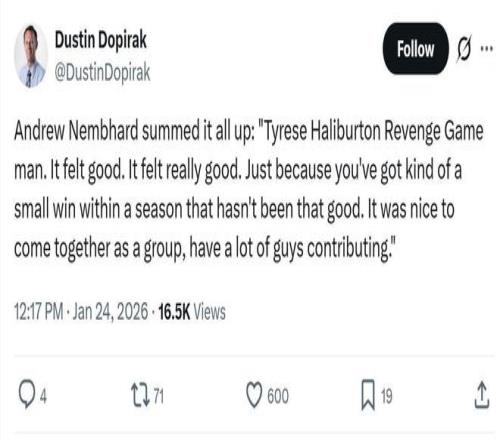 本場比賽就是如此,西卡、沃克與內姆哈德均交出20+得分表現,賽后內姆哈德直言:“這是哈利伯頓復仇之戰,感覺真得是太棒了!在這個賽季整體表現不佳的情況下,能夠取得這樣一場勝利真得太好了,很高興大家能夠齊心協力,共同努力,每個人都貢獻出自己的力量。”