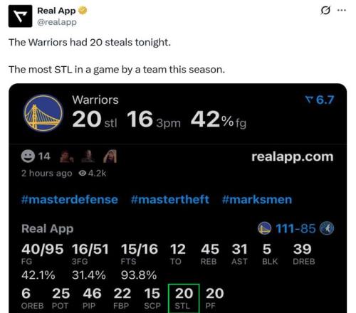 全場勇士隊(duì)一共送出多達(dá)20次搶斷,創(chuàng)造本賽季單場新高,其中首發(fā)庫里與波杰均送出4次搶斷,理查茲3次、追夢與桑托斯2次、霍福德、梅爾頓、波斯特、TJD、斯賓塞均有1次入賬。