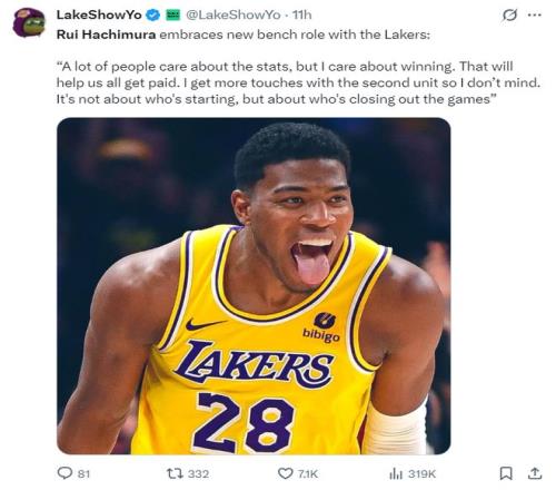 這場比賽的超級奇兵是八村壘,在賽前《洛杉磯時報》報道,八村壘已經接受了替補角色,他更在乎球隊的勝利而非個人數據,他甚至覺得自己在第二陣容可以獲得更多的出手機會。他還認為在決勝時刻登場比先發登場更有價值。