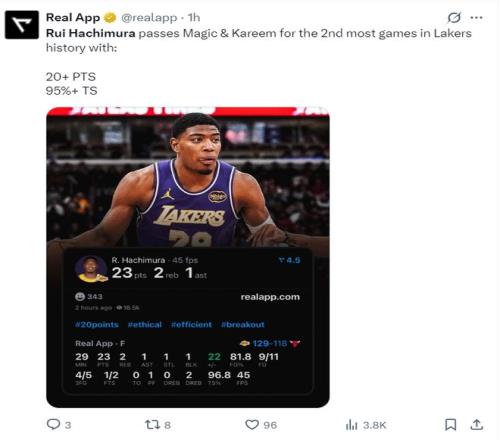 這場比賽后八村壘超越魔術師、賈巴爾成為湖人隊史拿下20+真實命中率95%以上第二多的球員,隊史第一是拜倫-斯科特4次。