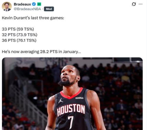 這也是杜蘭特火爆狀態(tài)的縮影,過去3場比賽杜蘭特場均苦戰(zhàn)40.6分鐘,連續(xù)三場交出30+得分表現(xiàn),場均能夠轟下33.7分7.3板2.7助,三項(xiàng)命中率54.7/50.0/81%,一月份至今場均拿下28.2分。