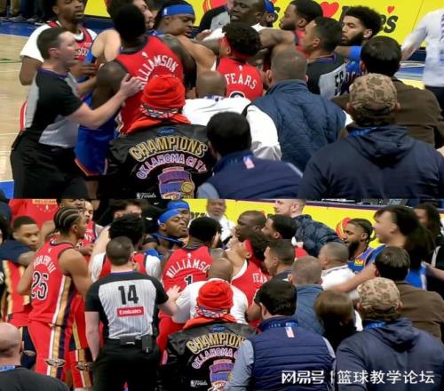 鵜鶘最后一攻,費爾斯搶到前場籃板,上籃時遭到多爾特犯規。費爾斯很生氣扭頭跟多爾特對峙,多爾特體型占優率先動手,直接揪住費爾斯衣領。比賽已經結束,兩隊球員都從場外沖了進來,二十幾人圍在一起,裁判都擠不進去。
