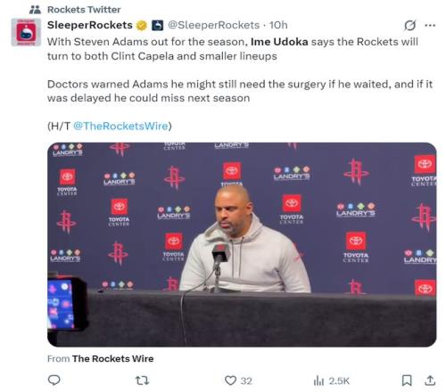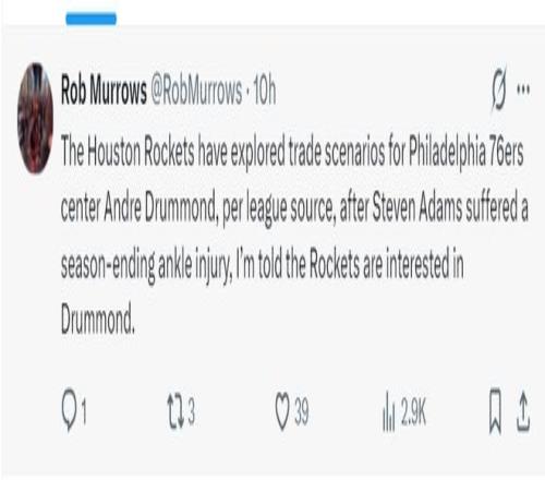 賽后根據美記Rob Murrows的報道,聯盟有消息人士透露,因為亞當斯左腳踝手術賽季報銷,火箭隊已經開始探索交易安德烈-德拉蒙德,休斯頓對莊神非常感興趣。