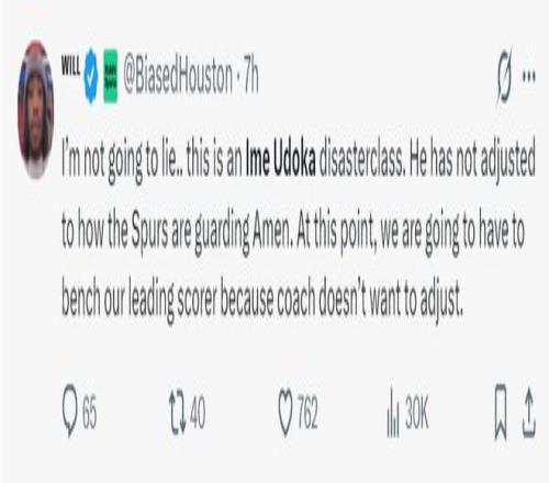 緊接著他繼續開炮:我不會瞎說,這場比賽就是烏度卡災難執教的一場,他沒有做好馬刺對阿門針對性防守的措施,我們不得不讓頭號得分手下場休息,因為教練不想做出任何的調整。