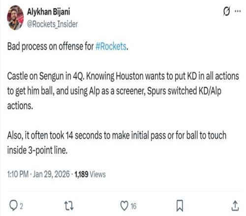 正如賽后火箭媒體人Alykhan Bijani所說:“火箭隊的進攻發起爛透了,馬刺用卡斯爾換防申京就直接破解了火箭隊的擋拆進攻,因為所有人都知道他們一定會將球交給杜蘭特。”