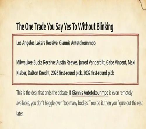 美媒《Fadeaway World》撰文建議,湖人應(yīng)該將里夫斯、克萊伯、文森特、范德比爾特、克內(nèi)克特以及2026年、2032年的首輪簽送到密爾沃基,換回字母哥。
