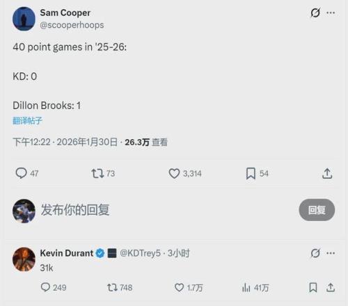 最近三場比賽,狄龍場均30.7分5.3籃板3助攻1搶斷1.3蓋帽,三項命中率:54%,47%,90%。有意思的是,賽后有個記者寫道:“狄龍本賽季1次40+,杜蘭特則是0次。”KD本人現(xiàn)身評論區(qū),只回復(fù)了一個數(shù)字:31000(分)。