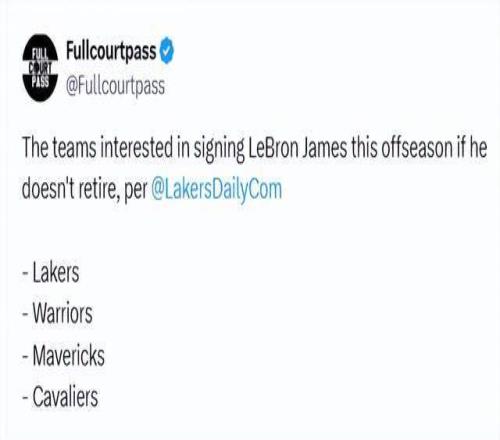 消息稱,詹姆斯的現(xiàn)東家洛杉磯湖人隊(duì),以及金州勇士隊(duì)、達(dá)拉斯獨(dú)行俠隊(duì)、克利夫蘭騎士隊(duì),均有意在休賽期簽下詹姆斯。