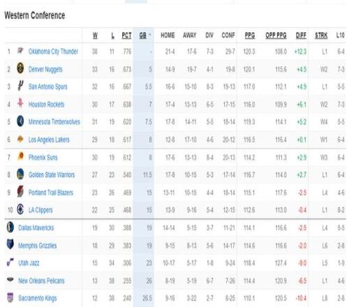 目前西部準(zhǔn)確的排名情況:雷霆、掘金、馬刺、火箭、森林狼、湖人、太陽(yáng)、勇士、開拓者、快船、獨(dú)行俠、灰熊、爵士、鵜鶘、國(guó)王。