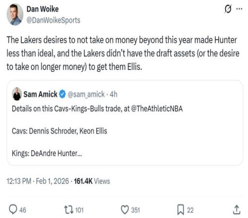 要知道,亨特的價(jià)值遠(yuǎn)沒有想象中的高,湖記Dan Woike就在交易達(dá)成后曝出紫金軍團(tuán)之所以被截胡,主要是因?yàn)椴辉敢獬袚?dān)亨特兩千多萬的薪水,同時(shí)也沒有足夠的選秀權(quán)追求埃利斯。