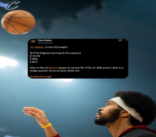 這場(chǎng)比賽是讓楊瀚森競(jìng)爭(zhēng)者克林根扎心一戰(zhàn),首節(jié)在克林根的防守下,騎士隊(duì)中鋒賈萊特-阿倫9分鐘里,10中8,拿到16分5籃板1搶斷2蓋帽,命中率80%,在籃下有4次很輕松的暴扣,他成為騎士隊(duì)史02-03賽季首位單場(chǎng)16+5+2蓋帽的球員。
