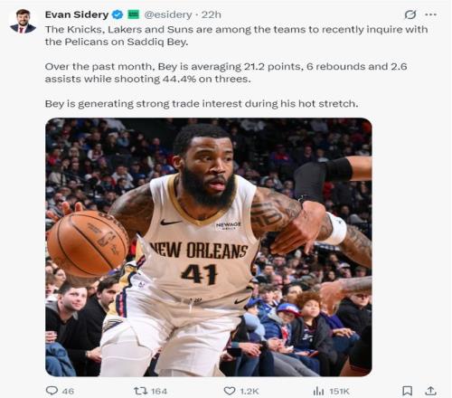 根據(jù)《福布斯體育》記者埃文-斯迪瑞的報(bào)道,尼克斯、湖人、太陽(yáng)正在追逐鵜鶘前鋒薩迪克-貝,過(guò)去一個(gè)月里貝場(chǎng)均21.2分6籃板2.6助攻,三分命中率高達(dá)44.4%,貝的火熱狀態(tài)引發(fā)了交易討論。