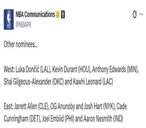 西部:東契奇(湖人)、杜蘭特(火箭)、愛德華茲(森林狼)、亞歷山大(雷霆)、萊昂納德(快船)