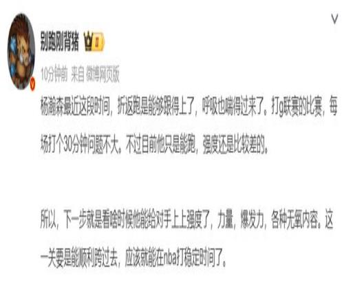 這場比賽國內的媒體人開始為小楊點贊,別跑剛背豬:楊瀚森這段時間折返跑跟得上了,呼吸也喘的過來。G聯賽的比賽打30分鐘不是問題,不過他的強度還是比較差,下一步就是提升強度,力量、爆發力各種無氧內容,這一關只要順利跨過去,應該就可以在NBA打穩定時間。