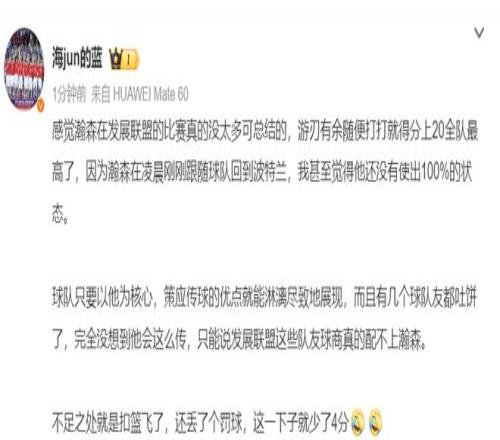 媒體人:感覺楊瀚森在G聯賽沒有太多可總結,比賽游刃有余得分上20全隊最高,而且他還剛剛跟隨開拓者從金州回到波特蘭,我甚至覺得他都還沒有100%發力。只要球隊以他為核心就可以展示策應的優點,而且幾個隊友球商跟不上還連續吐餅。