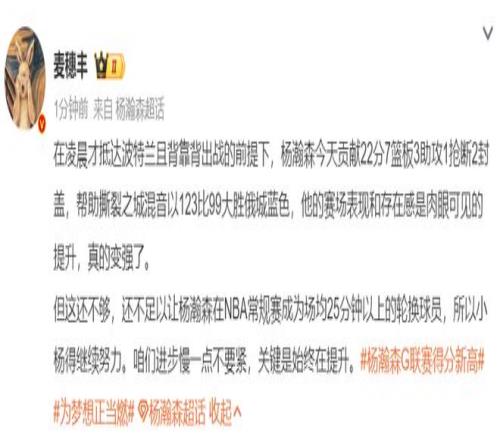 麥穗豐:楊瀚森22+7+3+1斷2帽,他的賽場表現與存在感肉眼可見的提升,真的變強了。但這還不足以讓他成為NBA常規賽場均25分鐘以上的輪換,小楊還需繼續努力。