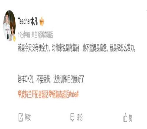 木凡:這場比賽感覺楊瀚森沒有發全力,對于他來說是背靠背也不是覺得疲累就是覺得沒怎么發力,不要受傷,達到訓練目的就可以。