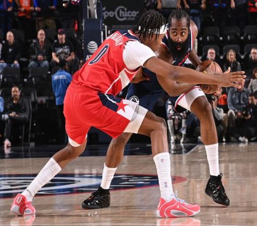 第三節奇才在喬治、巴格利、米德爾頓三人的帶領下打出一波34-17的攻防浪潮直接縮小到2分,期間哈登、小卡兩位超巨是頻頻打鐵。三節打完哈登17中5+三分9中2拿到20分7助攻5籃板,小卡三節打完13中5+三分7中3拿到19分2籃板3助攻,這兩位超巨的效率值都非常低,奇才也是趁機瘋狂追分。
