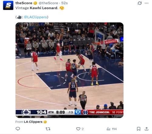 此役對陣奇才可能是覺得奇才孱弱沒有那么發力,所以前三節小卡的發揮很一般,可在第三節奇才瘋狂追分后,小卡在末節露出獠牙,短短7分鐘里小卡三分4中3連拿11分2搶斷1助攻1籃板直接幫助快船再度建立15分的優勢。最終小卡末節三分5中4拿到14分。