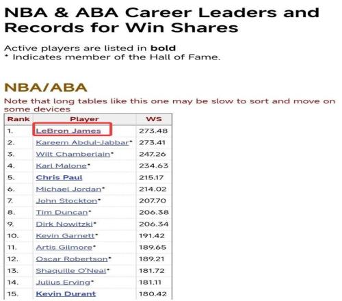 這場比賽后詹姆斯的常規(guī)賽Winshare(勝利貢獻值)已經(jīng)超過天勾賈巴爾登頂歷史第一,詹姆斯是273.48,賈巴爾273.41,接下來勒布朗的每一場比賽都會刷新勝利貢獻值歷史新高,他再度成為行走的紀錄產(chǎn)生儀。