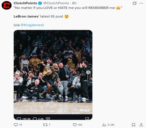 幾小時前勒布朗在個人IG更新了一句話:不管你是愛我還是恨我,但你一定會記住我。(他發(fā)布的是對陣老鷹比賽的圖)老頭也知道很多人還在罵他,但他根本無所謂。