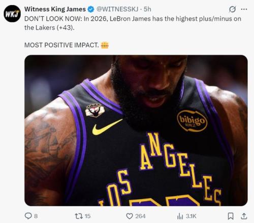 進入2026年后,41歲的詹姆斯正負值+43是湖人第一,此前不是很多人說勒布朗正負值差嗎?如今正負值都是最高的,這怎么說?