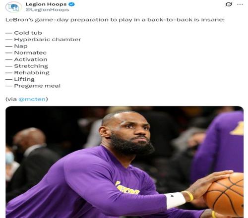 戴夫-麥克梅納明透露過41歲的詹姆斯為了出戰(zhàn)背靠背兩場比賽有多么的自律:冷水澡、高壓氧艙、小睡、玩一會游戲、冰敷膝蓋45分鐘、拉伸、康復治療、力量訓練、賽前餐。